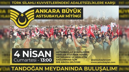 Astsubay camiasının uzun süredir gündemde olan hak arayışı kapsamında düzenlenecek "Büyük Astsubay Mitingi" için hazırlıklar hız kazandı. 4 Nisan 2026 tarihinde Ankara Tandoğan'da gerçekleştirilecek mitingin, geniş katılımla yapılması bekleniyor.